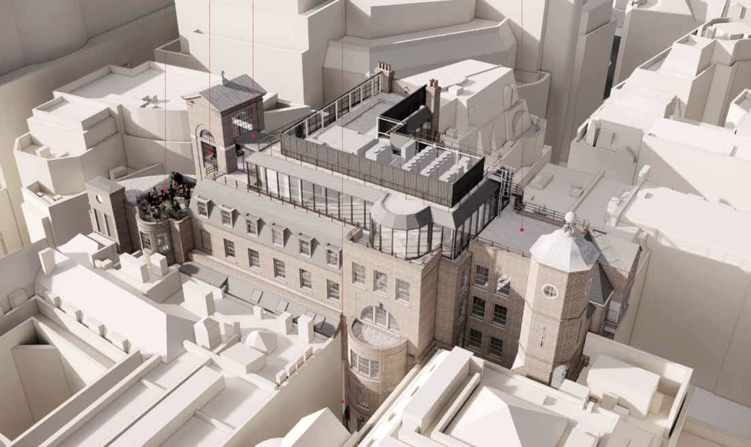 Creating a new main entrance by forming a façade opening and constructing a bridge across the basement lightwell. Refurbishing and reconfiguring the existing “bell tower” with new accommodation and a connecting stair between the 5th and 6th floors.